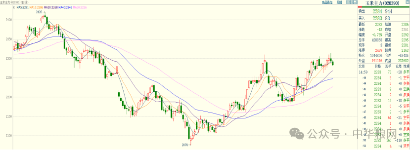 元旦后,国内玉米期货延续上涨趋势,主力合约连续五周收阳。但进入本周后涨势减弱,周一主力合约高开低走,盘中最高触及2314元/吨,再创新高,但最终收于2293元/吨,微跌5元/吨,为近期首次下跌。周二延续震荡下行,最低至2281元/吨,较高点回撤30余点。