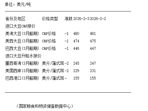 2月3日进口大豆到国内港口C&F及升贴水报价