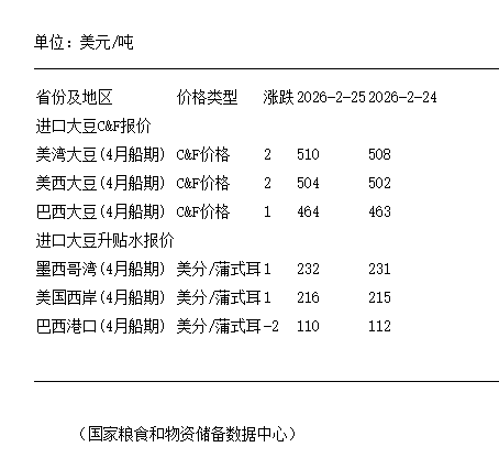 2月25日进口大豆到国内港口C&F及升贴水报价