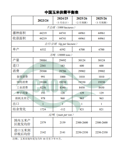 本月对中国玉米供需形势预测与上月保持一致。目前大部分饲料和深加工企业恢复正常生产,玉米饲用需求旺盛,市场购销活跃,期现货价格有所上涨。预计三月中下旬东北地区气温回升较快,但“地趴粮”所余不多,对农户售粮节奏和市场购销影响有限。 来源:农业农村部市场预警专家委员会